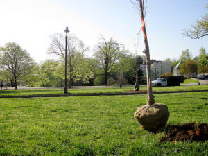 Balled and burlapped tree ready for planting. Trees must be carefully and properly planted if they are to live long, healthy lives. Choosing the right site for the for species, planting at the proper depth and watering for the first two years are essential.