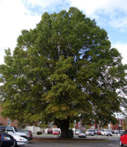 Willow oak on Main Street. Some trees will thrive the urban environment if they happen to be in just the right place. Many of our street trees have only very small spaces between the sidewalk and street. This tree has more room than most to spread its roots.